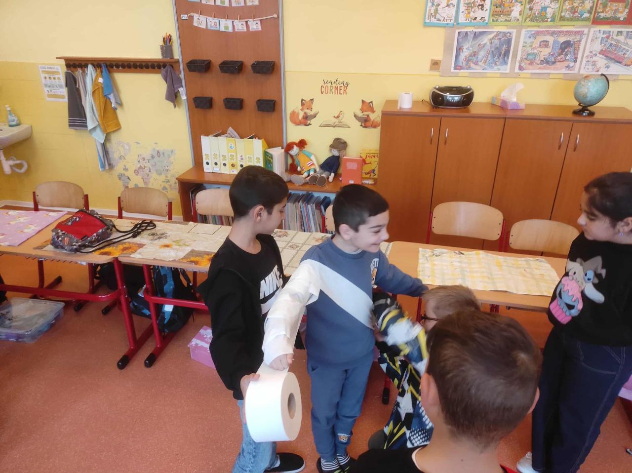 Žiaci 3. ročníka sa na hodinách výtvarnej výchovy prostredníctvom fantázie „preniesli“ do staroveku a pokúsili sa vytvoriť múmiu. Telo svojho spolužiaka postupne obalili a pomocou lepiacej pásky vytvorili model starovekej múmie. Obaľovali, lepili, formovali... Bola to zábava, ale aj poznávanie nového. Samozrejme, že pri práci žiaci dodržiavali bezpečnostné pokyny, aby neublížili ani sebe, ani spolužiakovi, ktorý predstavoval múmiu. Vypracovala: Mgr. Andrea Ceklárová